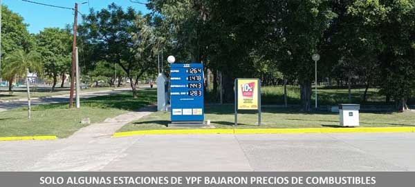 En tanto las estaciones de servicios de AXION la nafta Súper a $ 1331, la Quantium a $ 1636, el gasoil Diésel a $ 1421 y el Quantium a $ 1636. SHELL naftas Súper a $ 1349, la V Power a $ 1645, en tanto el Gasoil Común a $ 1399 y el V-Power $ 1649. Por último, las de Bandera Blanca la nafta Súper $ 1220, la Premium $ 1350 y la Gasolina Común a $ 1590, el Euro Diésel a $ 1599. Al mediodía de este 1 de mayo del corriente año, YPF modificó sus precios quedando la Súper a $1264; Súper Infinia $1478; Diesel $1283 y la Diesel Infinia $1443. Por lo que se esperará, el comportamiento de las demás empresas, tanto de capital como del interior, para constatar si se producen o no las bajas en los precios anunciados por el Gobierno Nacional.