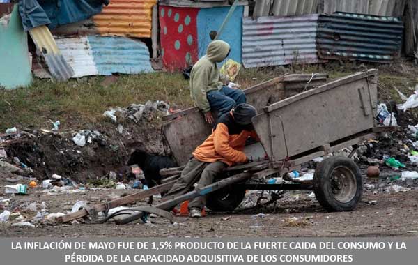 Llamativamente los alimentos y bebidas no alcohólicas variaron 0,5% en mayo. Sin embargo, el consumo sigue en caída y las familias están cada vez más endeudadas. De esta manera, la desaceleración inflacionaria poco se siente en los bolsillos de las clases trabajadoras y origina una acumulación y distribución de riquezas totalmente desequilibrada. Sobre la base de un fuerte endeudamiento externo público que actúa como un factor atenuante de la inflación, se le suma un ajuste recesivo que continúa desplomando los ingresos de los trabajadores y el consumo. En marzo la economía se contrajo 1,8% respecto al mes anterior, “por lo que el común de la gente no ve ni siente y menos aún se beneficia con estos indicadores, ya que no se reflejan ni en las góndolas, medicamentos, alquileres, combustibles, comunicaciones y servicios esenciales”.