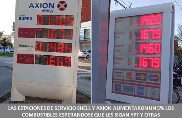 Desde el fin de semana por el aumento del crudo, como consecuencia del conflicto de Medio Oriente, las estaciones de servicio Shell y AXION incrementaron sus costos en un 5%, quedando en las expendedoras de formosa los siguientes precios: YPF nafta Súper a $ 1281, el Diésel 500 a $ 1304, el Diésel Premium a $ 1465. * En tanto las estaciones de servicios de AXION la nafta Súper a $ 1385, la Quantium a $ 1671, el gasoil Diésel a $ 1485 y el Quantium a $ 1669. * SHELL naftas Súper a $ 1420, la V Power a $ 1679, en tanto el Gasoil Común a $ 1460 y el V-Power $ 1679. * Por último, las de Bandera Blanca la nafta Súper $ 1220, la Premium $ 1390 y la Gasolina Común a $ 1590, el Euro Diésel a $ 1599.
