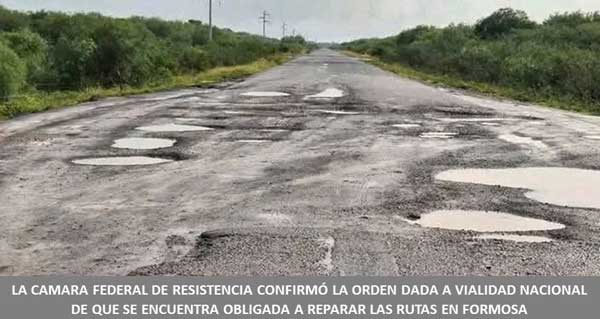 La Cámara Federal de Resistencia, en un extenso fallo, rechazo el Recurso de Apelación interpuesto por el Gobierno Nacional – Dirección Nacional de Vialidad (DNV), contra la Medida Cautelar dictada por el Juzgado Federal Nº 1 de Formosa, a cargo del Dr. Pablo Morán, la cual ordenó a la DNV, ejecutar en el plazo de noventa (90) días, las obras necesarias para reparar/rellenar los pozos, protuberancias y sellado de grietas existentes y que por su estado sean considerados peligrosos para el normal tránsito vial mediante tareas de bacheo y su posterior mantenimiento, como así la limpieza de banquinas de los puntos indicados en las Rutas Nacionales Nº 11, 81, 86 y 95. La demanda, fue presentada por la Fundación Unidos por el Dolor, presidida por Alberto Daniel Gauna, la “Asociación Argentina de Transportadores de Hacienda” (A.A.T.H.A.), dirigida por Mario A. Emmert y el “Sindicato de Choferes de Camiones y Obreros del Transporte Automotor de Cargas” encabezada por su Secretario General, Sergio C. Recalde, con el patrocinio de la Defensoría del Pueblo de la Provincia, a cargo de José Leonardo Gialluca.